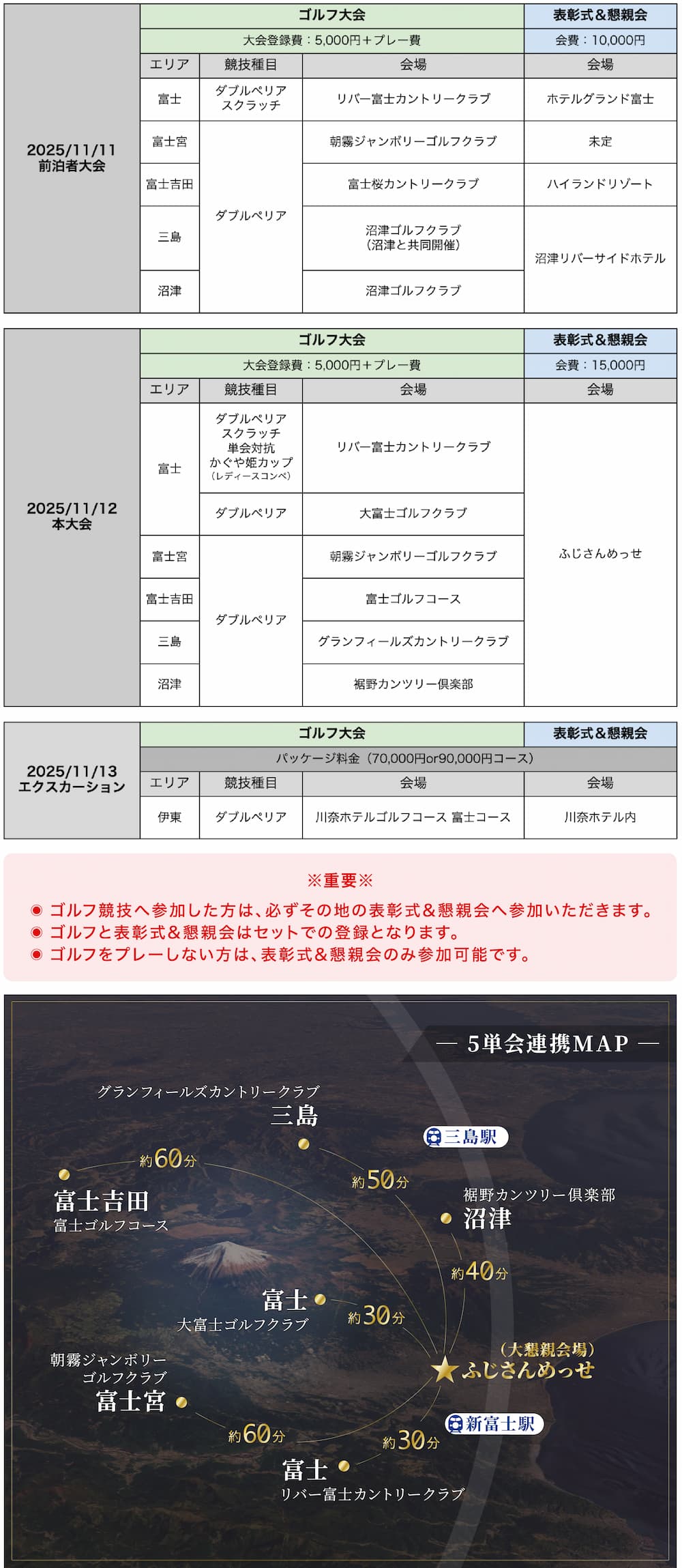 そんな熱い思いから、富士YEGと富士山を取り巻く5つのまちが連携し、ゴルフ大会の招致に立ち上がりました。当ゴルフ大会は富士YEGが主催し、富士山(富嶽)の周りを取り囲む、富士宮市・富士吉田市・三島市・沼津市それぞれが環になって輝けるよう「環富士山大会」と命名いたしました。